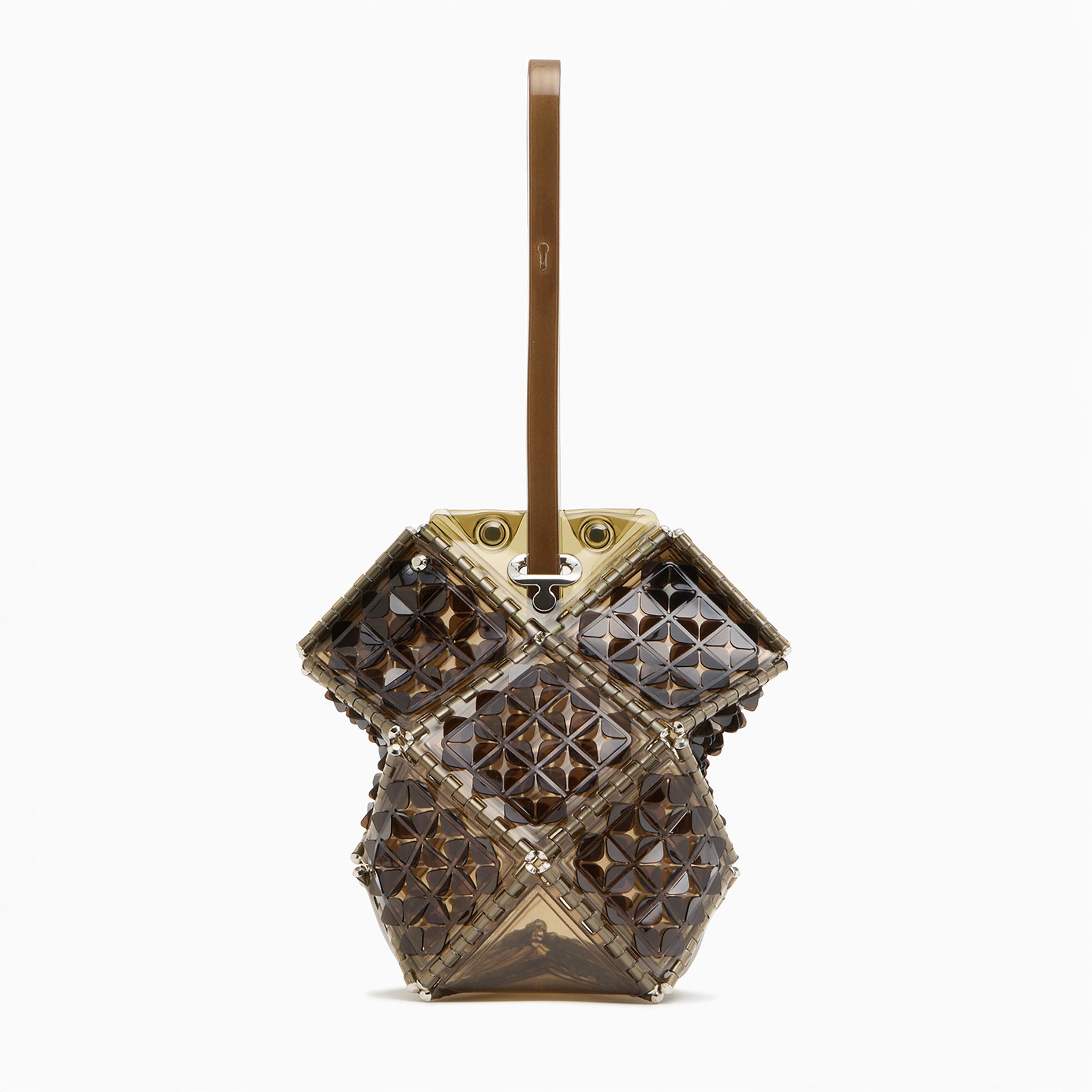 風にゆらぐ小さな葉の集まり、ハーブの香りをイメージして作りました。葉が重なることで透明感のあるピースからバッグの中が見え隠れする効果が、立体感のあるフォルムと相まって、不思議な表情を生み出しています。