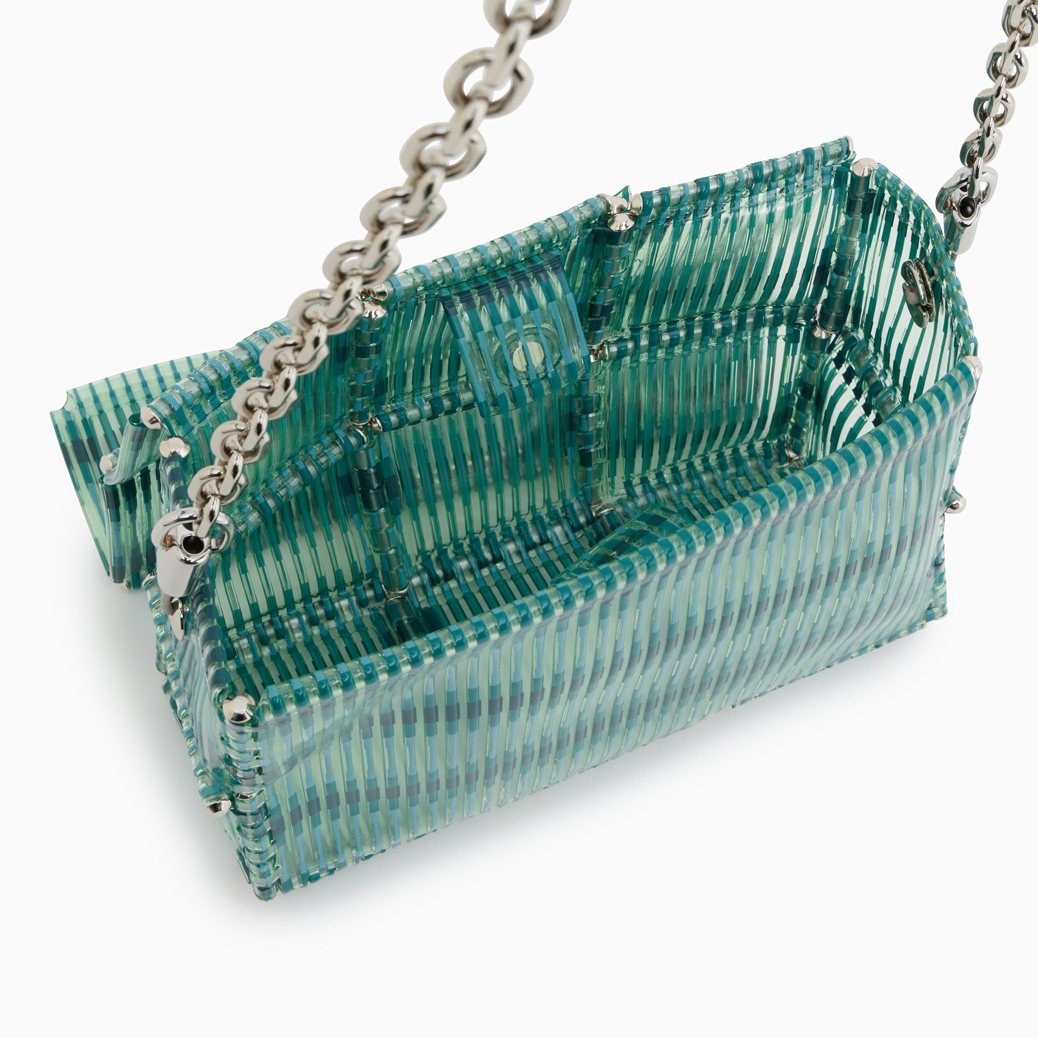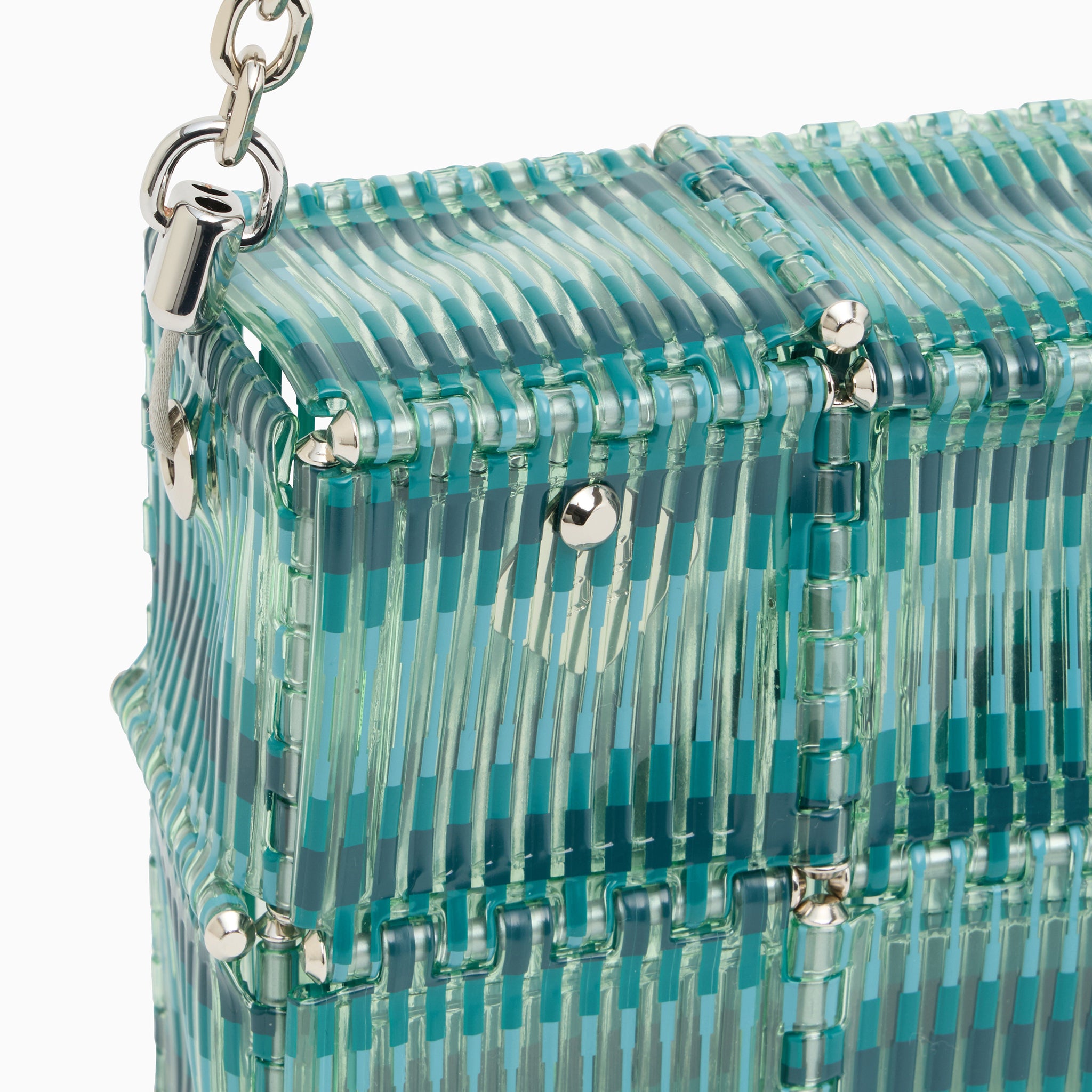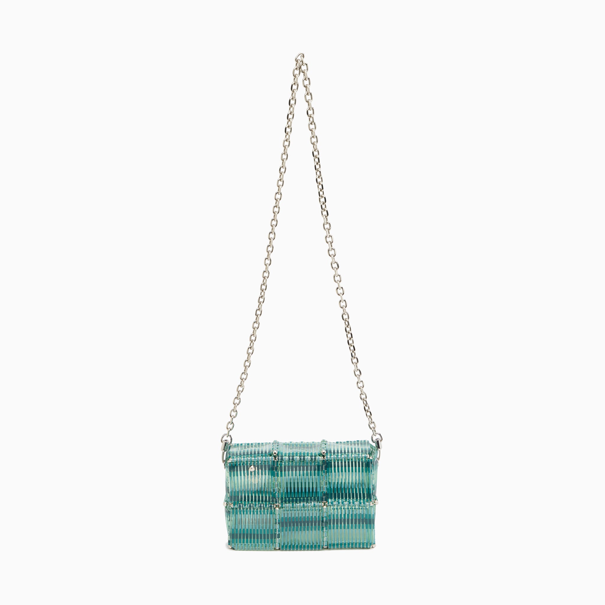 トーナルバージョンをクリーンな印象の〈CUBES〉に落とし込み、凹凸ある質感や幾何学構造、モアレ、同系色の穏やかなカラーが静かで洗練された表情を演出。シルクスクリーンとグラデーションが奥行きとリズムを生み、立体構造やチェーンハンドルが機能性とトレンドを兼ね備えた一品に。